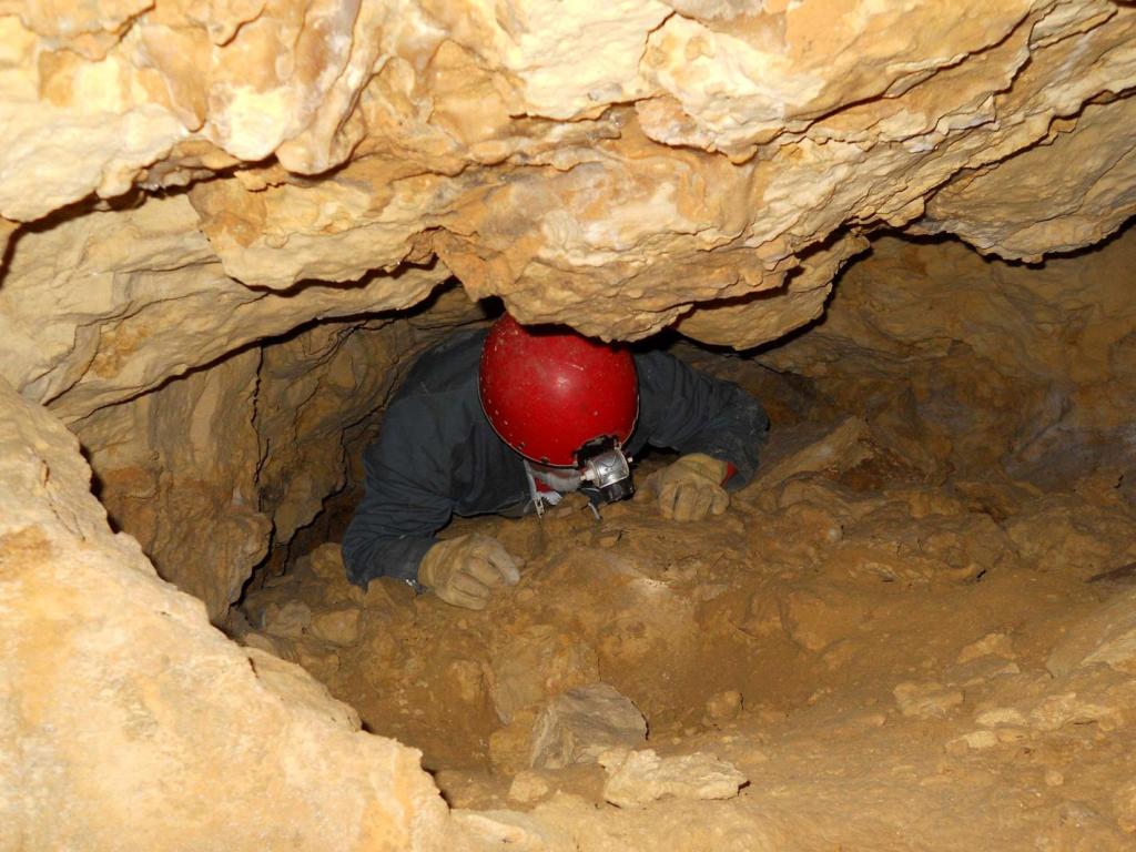Au-delà de la chatière qui limitait l’exploration, nous avons parcourus les derniers mètres du drain secondaire qui développe 21 m. Nous avons atteint une confluence débouchant sur un drain majeur, un collecteur de belles dimensions. La largeur de ce dernier atteint par endroit, 5 m. Cette galerie principale a été reconnue sur 32 m, l’exploration étant limitée, tant en amont qu’en aval, par d’imposants effondrements de voûte. Le développement total est de l’ordre de 55 m, en incluant une cheminée d’équilibre dans l’amont du collecteur.